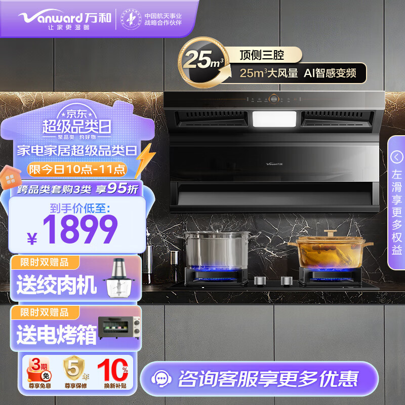 万和(Vanward)顶侧双吸油烟机 三腔直流变频抽油烟机 25m3/min大吸力 1000Pa风压 家用自清洗油烟机 WL860价格:1898.00元!