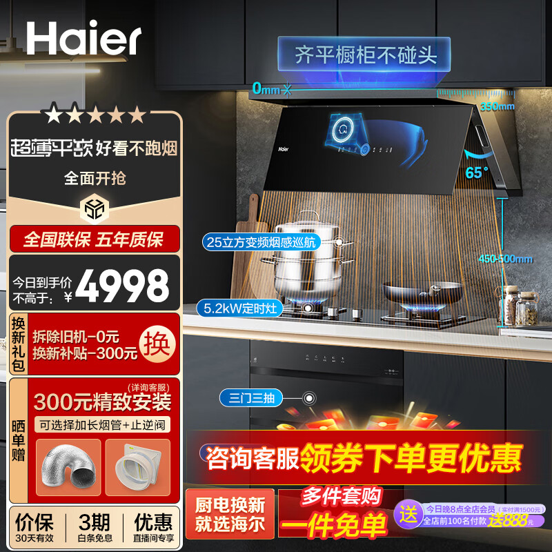 海尔(Haier)抽油烟机 超薄平嵌烟灶消三件套 25m3/min大吸力 5.2kw定时灶 110L三抽消毒C21U1+Q2BE7天+EB031价格:4998.00元!