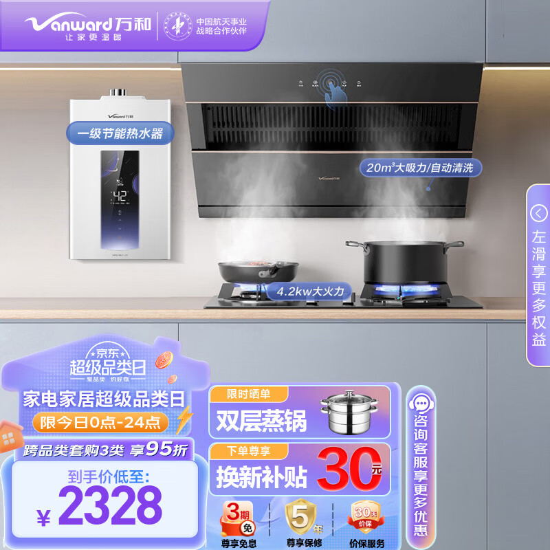 万和(Vanward)侧吸式油烟机燃气灶具恒温热水器套装J525S+B3L20+ME5J16(天然气)价格:2328.00元!