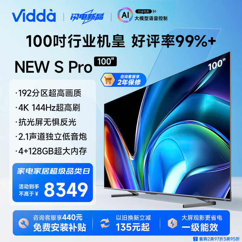 Vidda NEW S100 Pro 电视100英寸 一级能效 192分区 4+128G 北京以旧换新智能液晶游戏巨幕100V1N-PRO价格:8349.00元!