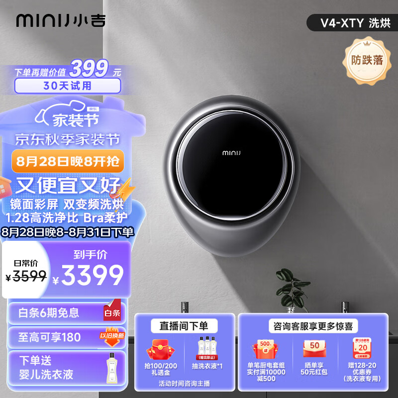 小吉(MINIJ)彩膜智慧大屏壁挂 迷你滚筒洗烘一体洗衣机全自动 DD直驱变频 专属母婴洗衣机 V4-XTY价格:3399.00元!