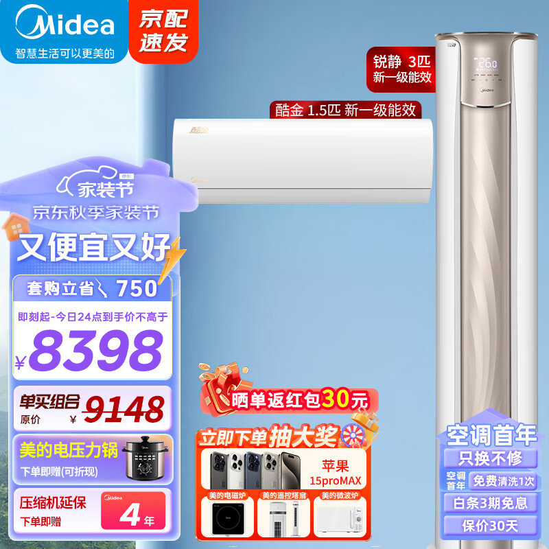 美的(Midea)空调套装 新一级能效 一室一厅套餐 全直流变频冷暖自清洁一键防直吹 挂机酷金1.5匹+柜机锐静3匹价格:8398.00元!