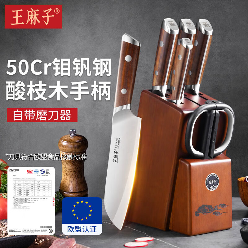 王麻子厨房刀具套装 50Cr钼钒钢流云刀具菜刀7件套组合带剪刀价格:799.00元!