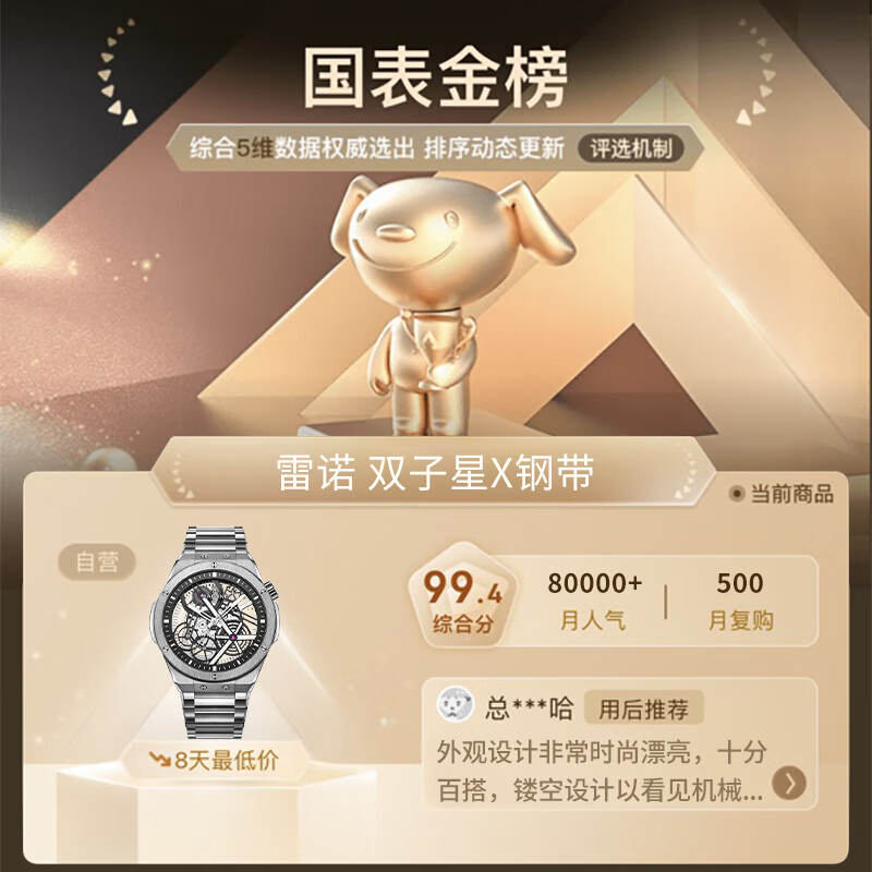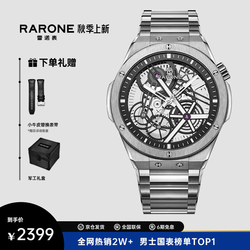 雷诺(RARONE)双子星X时轮全景镂空机械表夜光国表男士腕表钢带礼物送男友价格:2399.00元!