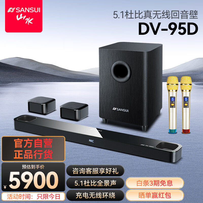 山水(SANSUI)DV-95D回音壁5.1声道杜比全景声电视音响套装 家庭影院 无线环绕Soundbar条形音箱 10英寸低音炮价格:5900.00元!