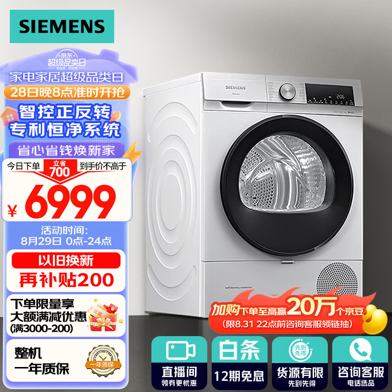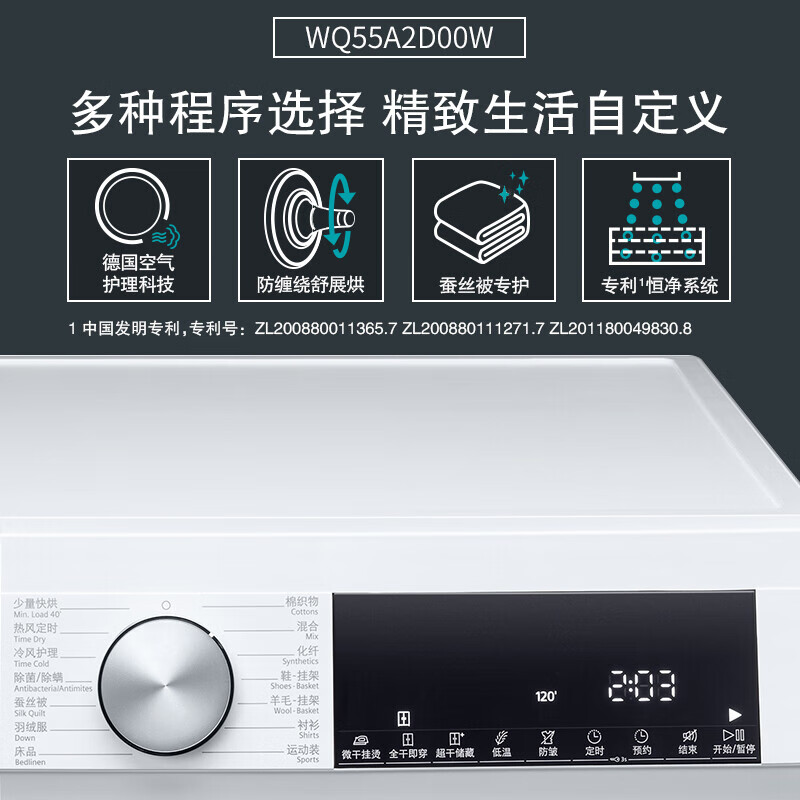 西门子(SIEMENS) 烘干机家用 10公斤热泵干衣机 除菌除螨 防缠绕舒展烘 蚕丝被专护 WQ55A2D00W价格:7199.00元!