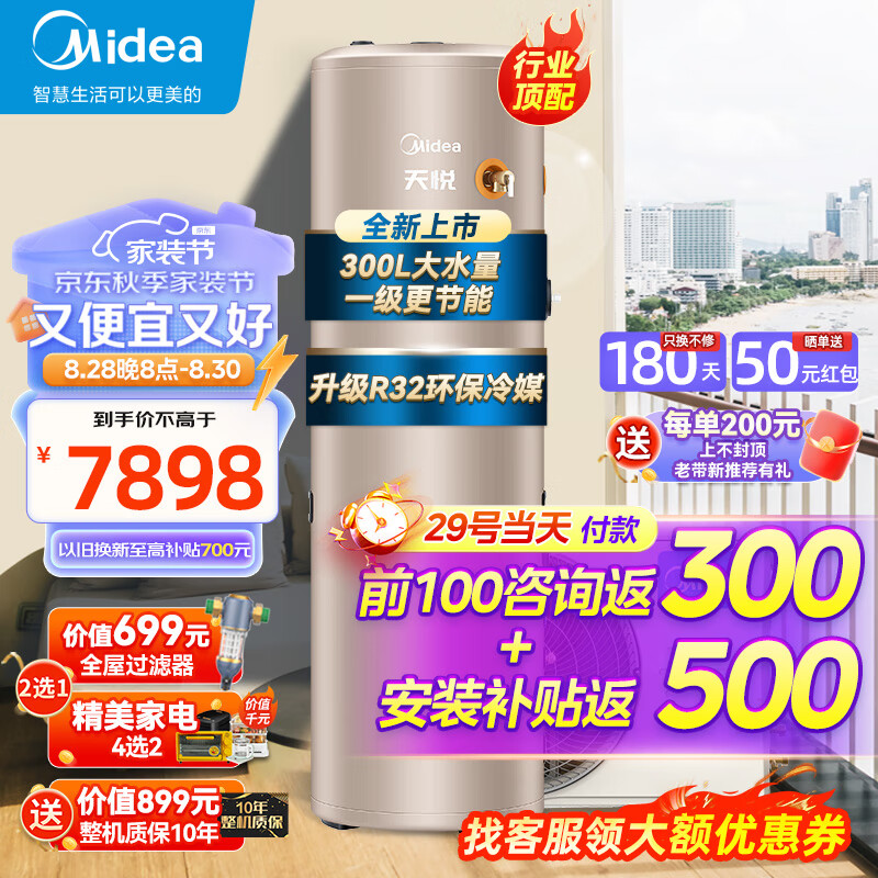 美的(Midea)新品首发空气能热水器家用300升大容量包安装超一级能效水洗R32冷媒天悦RSJF-51/N8-300C(E1)价格:8198.00元!