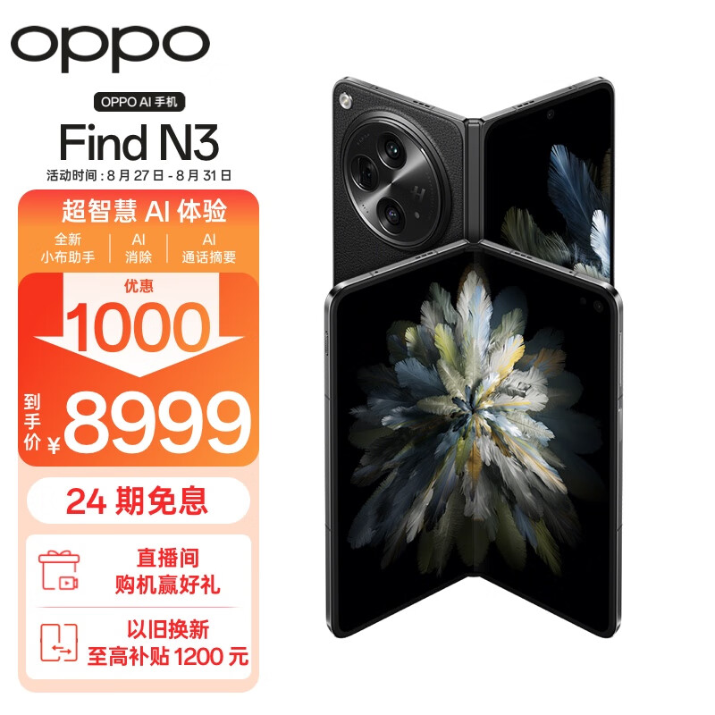 OPPO Find N3 12GB+512GB 潜航黑 超光影三主摄 国密认证芯片 哈苏人像 骁龙 5G 拍照AI折叠屏手机价格:8999.00元!