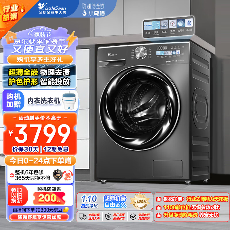 小天鹅(LittleSwan)滚筒洗衣机全自动家用 超薄全嵌【小乌梅 TG100RVIC】超微净泡 内衣洗 水魔方 10公斤 以旧换新价格:3799.00元!