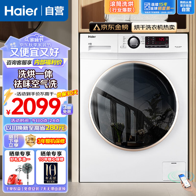 海尔(Haier)洗衣机全自动滚筒家用洗烘一体机10公斤超薄大容量除菌除螨智控WIFI空气洗海尔白100U1价格:2099.00元!
