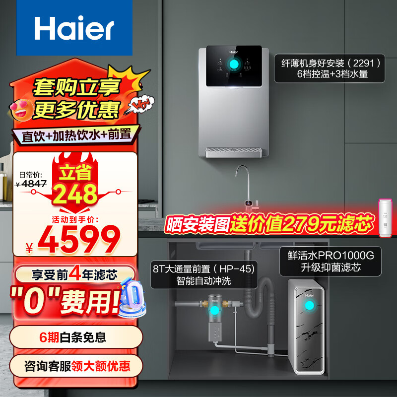 海尔(Haier)直饮加热净水器1000G鲜活水pro5年厨下净水器+前置过滤器+管线机HKC2400-R791D2U1+HP45+R2291价格:4599.00元!