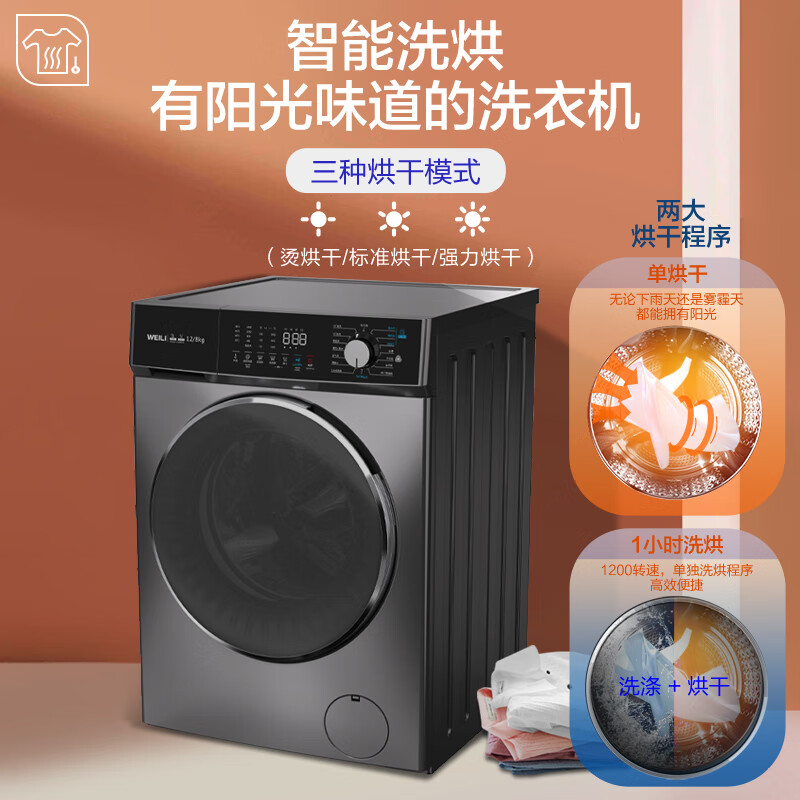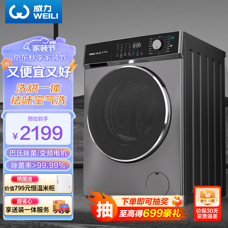 威力(WEILI)滚筒洗衣机 12KG变频大容量洗烘一体 祛味空气洗蒸汽除菌 BLDC节能电机 XQG120-1428DPHX送装一体价格:2199.00元!