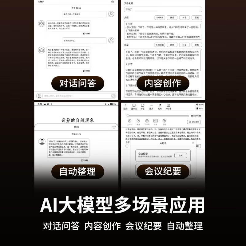 2、屏幕尺寸:大小非常合适,携带也方便看着更爽,显示效果要比其他品牌好,看着舒服不累眼睛,如同纸书般舒服。响应速度:速度还是很快的,比我用的海信A7快多了。续航能力:不得不说这个续航实在是太给力了,看书一天,软件运行待机2天才下去4格电护眼效果:护眼没得说,太给力了,久看不累其他特色:智能AI很好用,学习备注,手写真是太舒服了,还有实时语音转换很实用。