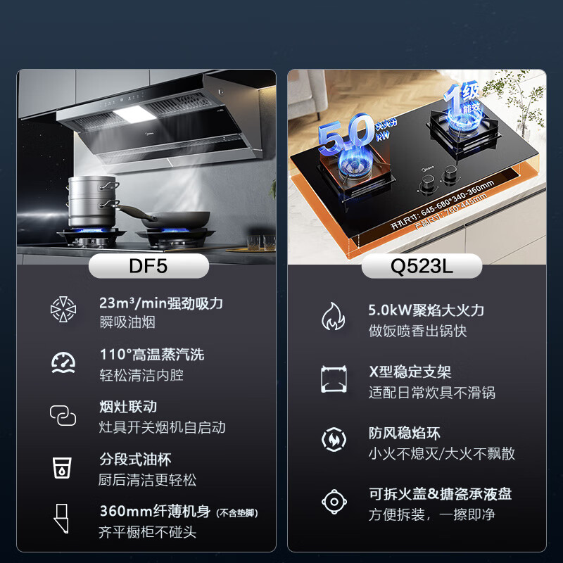 美的(Midea)抽油烟机 家用厨房顶侧双吸23吸力蒸汽洗 排油烟机烟灶联动套装DF5+Q523L天然气价格:3499.00元!