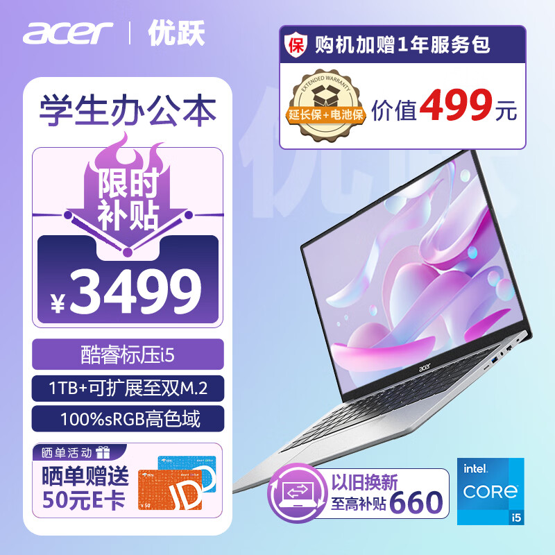 宏碁(Acer)优跃笔记本电脑 13代酷睿i5 14英寸办公学生轻薄本(i5-13500H 16G 1T 100%sRGB 背光键盘)银价格:3599.00元!