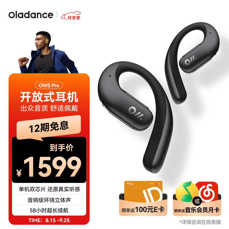 OladanceOWS Pro 全开放式耳机(含充电仓)无线蓝牙不入耳防漏音运动耳机超长续航 黑价格:1599.00元!