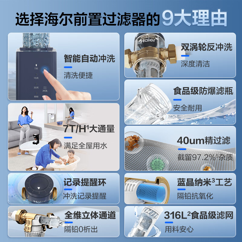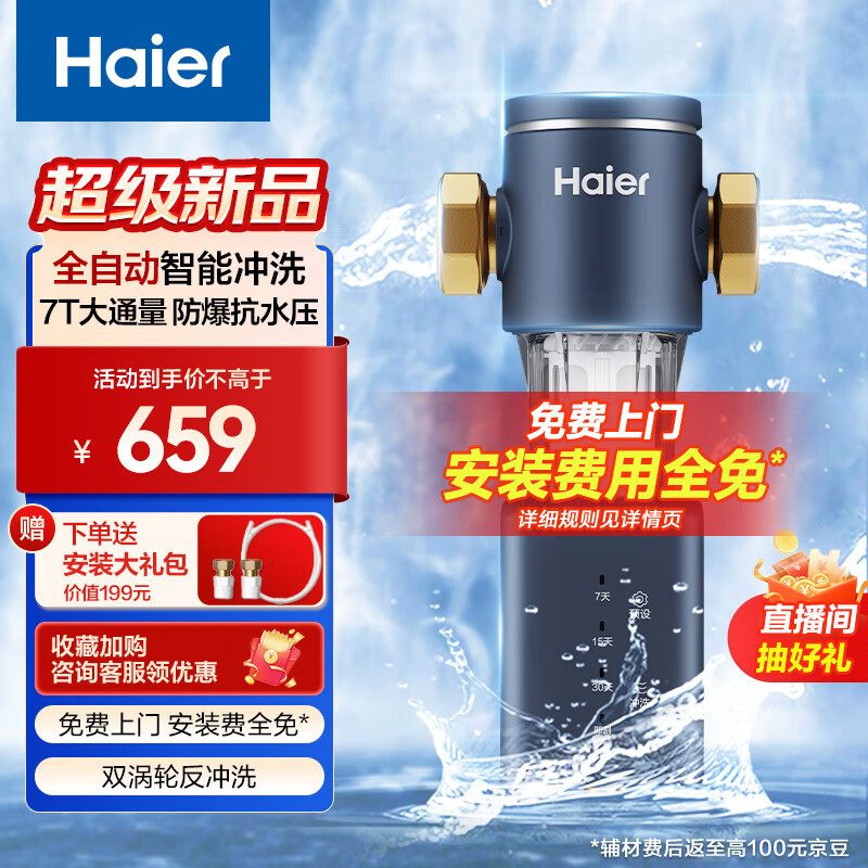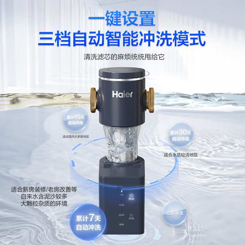 海尔前置过滤器7T大通量家用智能净水器40微米自动反冲洗精滤实时水压监测全屋净水机HQZ50-XFAZ08价格:659.00元!