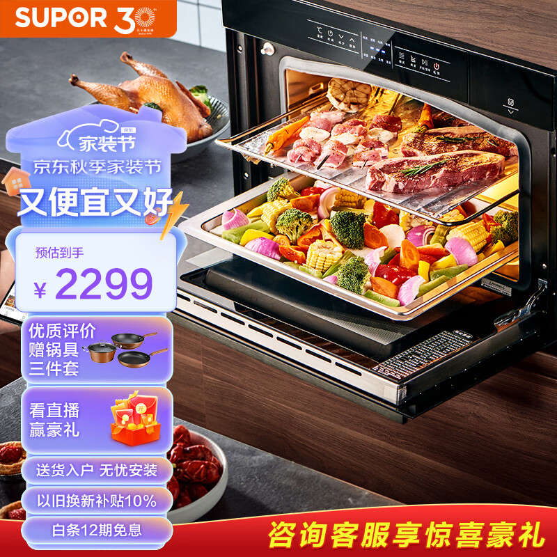 苏泊尔(SUPOR)嵌入式蒸烤箱一体机 家用蒸烤箱 速热智能控制 烤箱电蒸箱多功能大容量40L 709蒸烤价格:2299.00元!