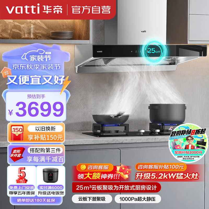 华帝(VATTI)欧式顶吸官方抽油烟机家用变频大吸力燃气灶具烟灶套装25风量自动清洗京东小家i11S18天然气价格:3899.00元!