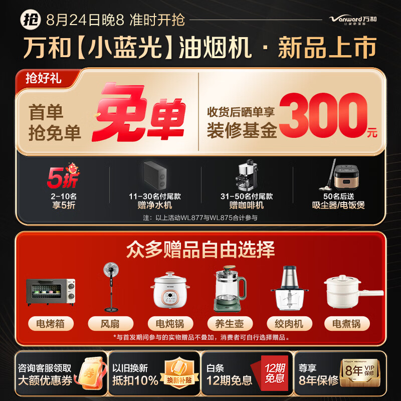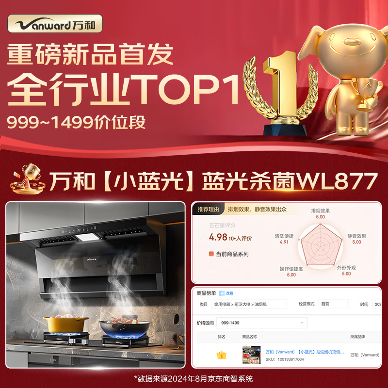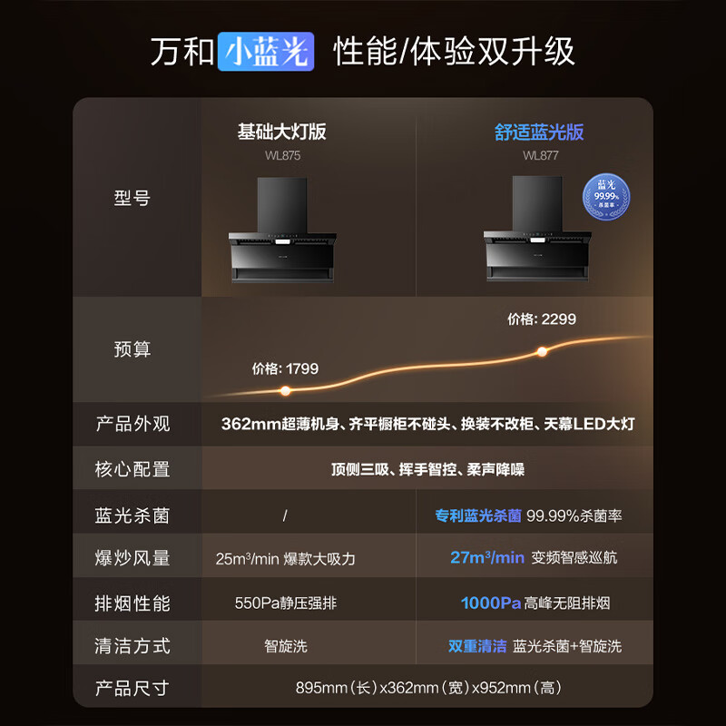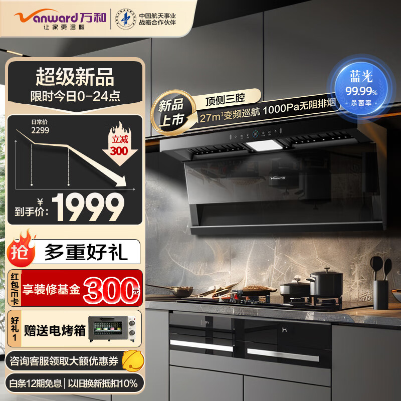 万和(Vanward)【小蓝光】抽油烟机顶侧三腔1000Pa直流变频 99.99%蓝光杀菌 27风量大吸力WL877价格:2298.00元!