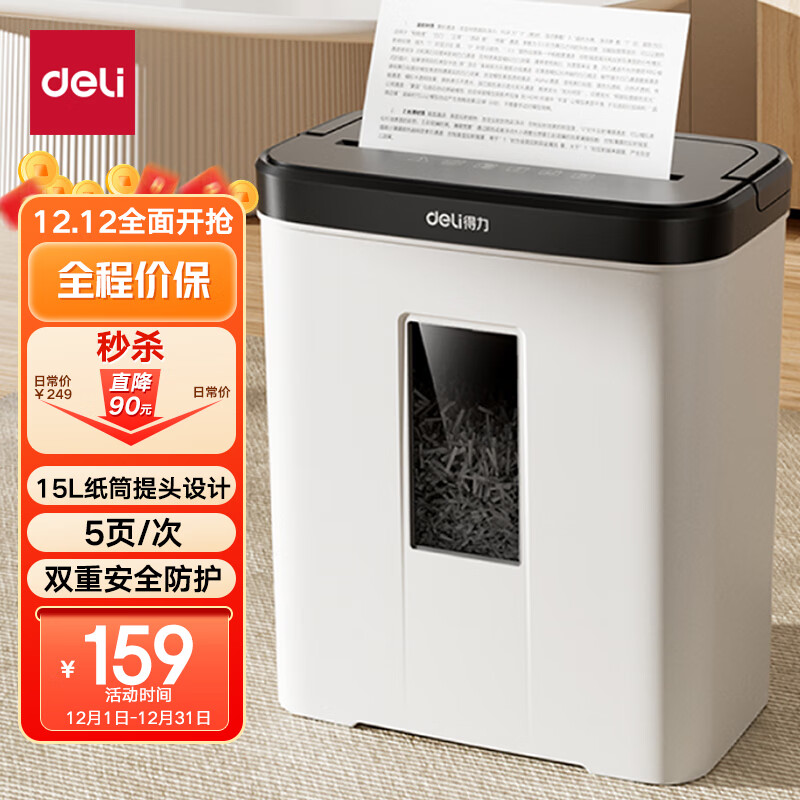 得力(deli)碎纸机 4级高保密 家用商用办公碎纸机 反向退纸(15L 持续5分钟 可碎卡 180天只换不修)9939N价格:249.00元!