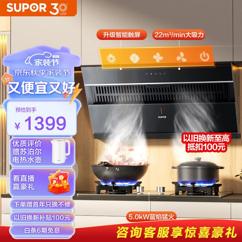 苏泊尔(SUPOR)抽油烟机侧吸式爆炒22立方大吸力家用吸油烟机450pa强劲风压油烟机燃气灶套装DJ11+DS35天价格:1399.00元!