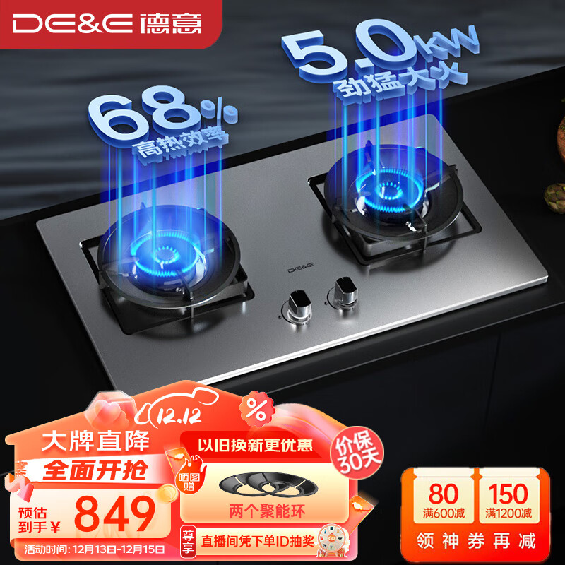 德意(DE&E)燃气灶 天然气 不锈钢 双眼灶具 5.0kW大火力 68%热效率 全尺寸适配嵌入式灶具 716G价格:899.00元!