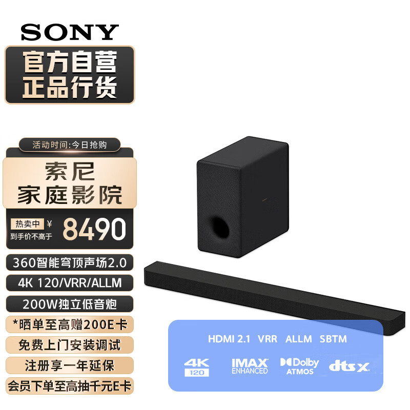 索尼(SONY)HT-A8000+SW3 低音强化套装 360智能穹顶 回音壁 4K120Hz VRR ALLM 家庭影院 电视音响 蓝牙价格:8490.00元!