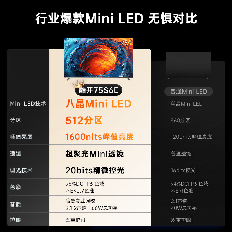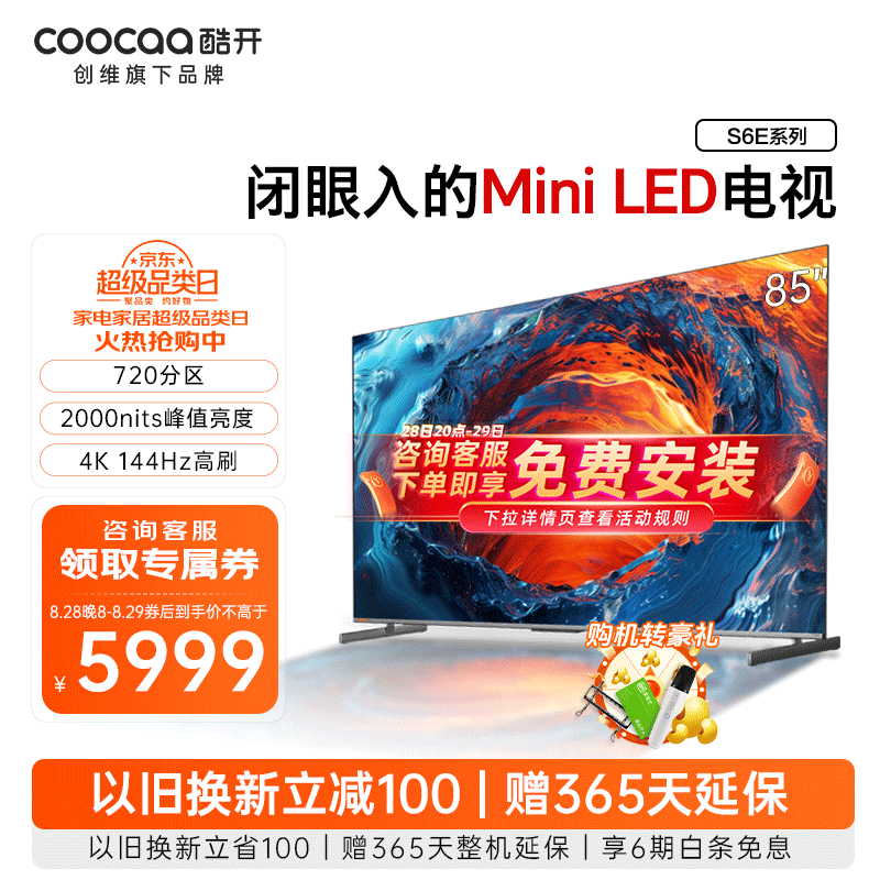 酷开 创维电视S6E 85英寸 Mini LED电视 720分区 2000nits 4K144Hz高刷 护眼智能平板电视机以旧换新 K 85英寸价格:5999.00元!