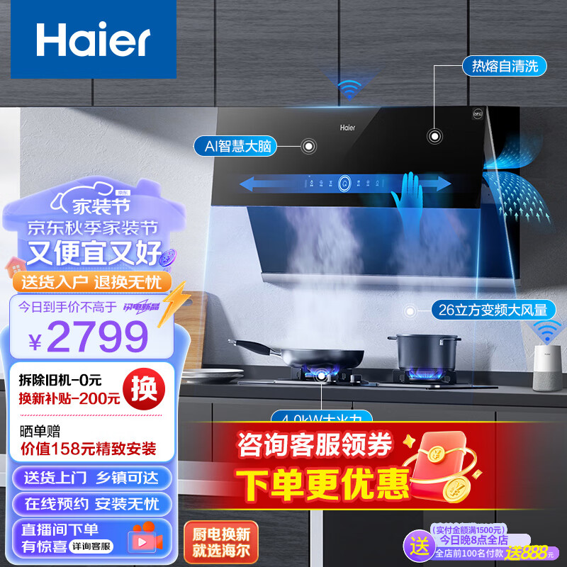 2、海尔有效风烟机,吸力很大,大到菜香味都闻不见了。以前都是厨房烟雾腾腾的,饭厅里也能闻到油烟味,现在厨房味道明显小了。三分线延迟关机功能很好用,关火后持续净烟。安装中发生了小插曲,客服反馈后积极处理,比较满意。