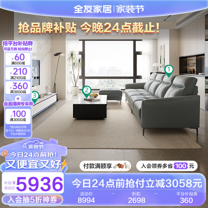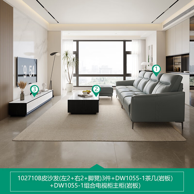 全友家居 简约客厅三件套装组合皮沙发岩板茶几电视柜主柜家具102710价格:8994.29元!