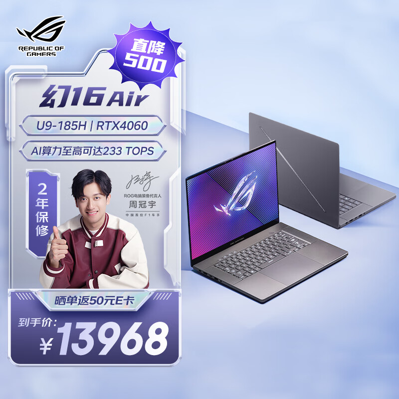 ROG幻16 Air 酷睿Ultra 9 16英寸设计师游戏本笔记本电脑(U9-185H 32G 1T RTX4060 2.5K 240Hz)日蚀灰价格:13969.00元!