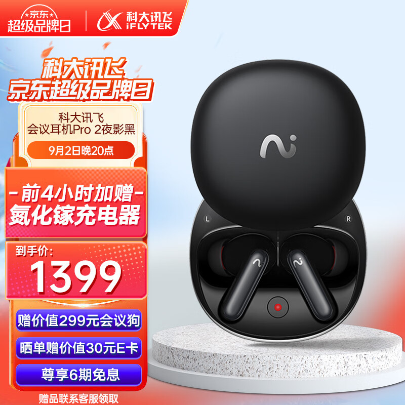 科大讯飞【旗舰新款】录音降噪会议耳机Pro2夜影黑 一键闪录 AI会议助理 同传翻译 主动降噪 苹果华为通用价格:1599.00元!