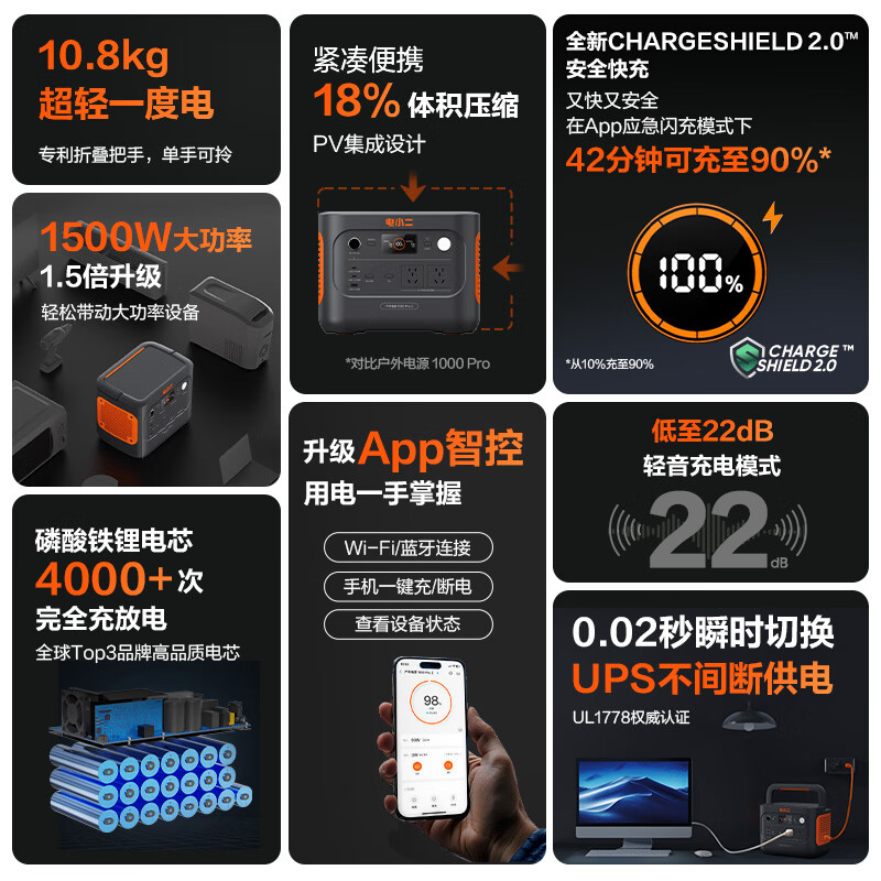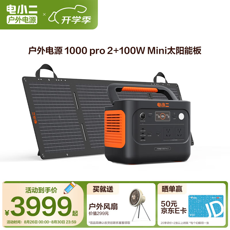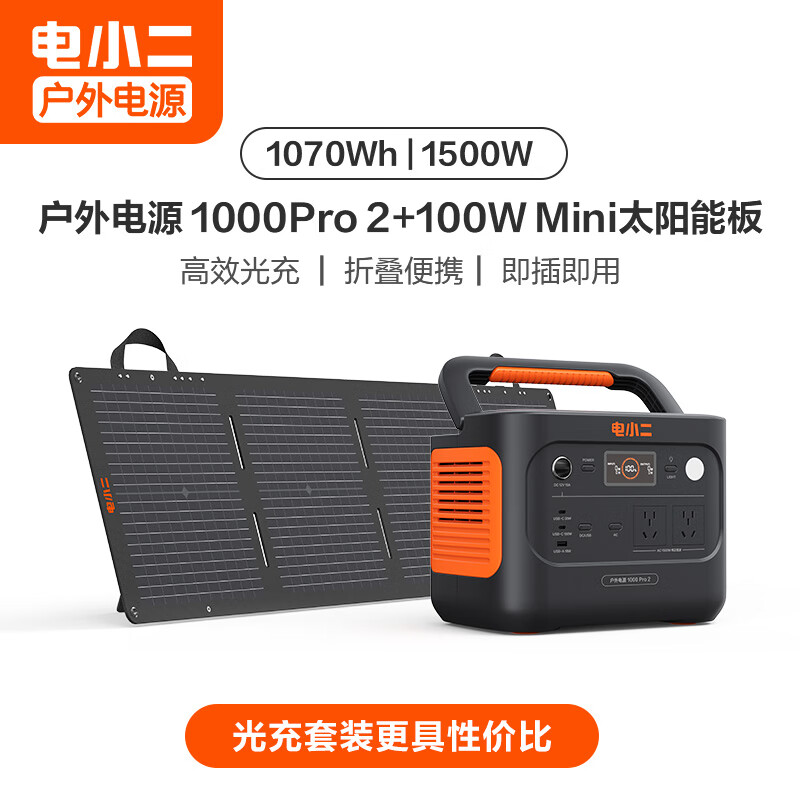 电小二【1度电新品+100W光充套装】快充户外电源1500W大功率大容量220V移动电源车载露营应急蓄电池价格:3999.00元!