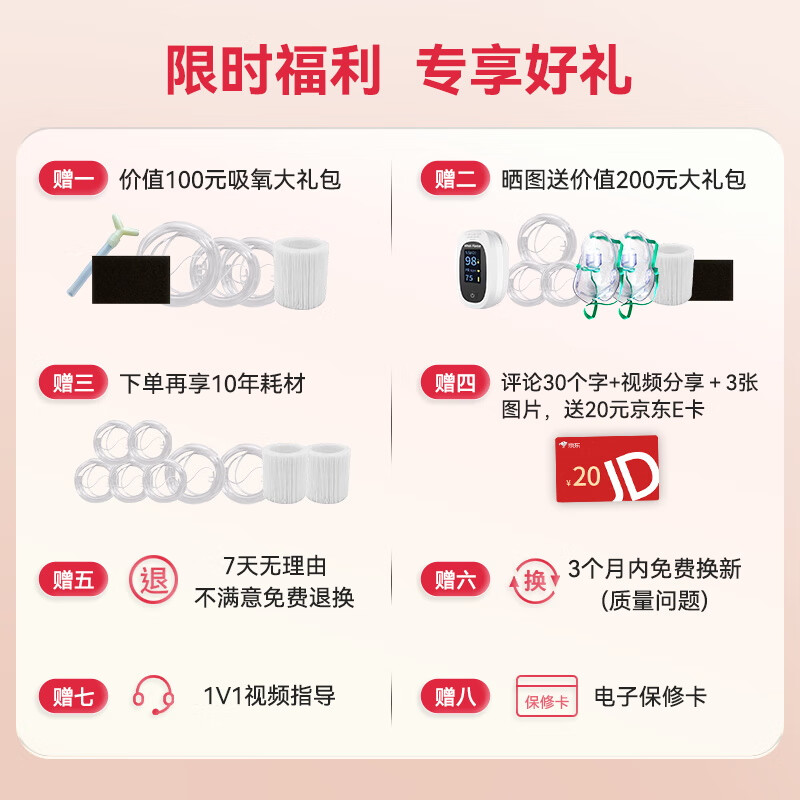 4、东西收到了,说明书简单明了,操作也很简单,适合家里长辈使用。送的加长款吸氧管也很实用,可以在客厅吸氧了,目前来看挺不错的。快递小哥也很好,电话联系确认时间后,送货上门了