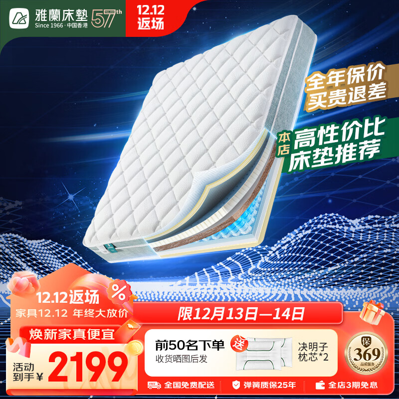 5、雅兰老牌子,我选了很多牌子,这款性价比高,比较合适,双面的,软硬适中,适合全家人,果断买了2个,物流快,第二天就到,师傅送上门,安装好才走,建议大家买,还可以配一个床,颜色也可干净,也有其他款式,还有儿童的。