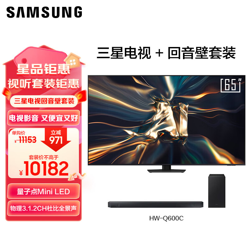 三星(SAMSUNG)65QNX9D 65英寸 Neo QLED量子点 Mini LED电视 QA65QNX9DAJXXZ+HW-Q600C/XZ套装价格:10182.10元!
