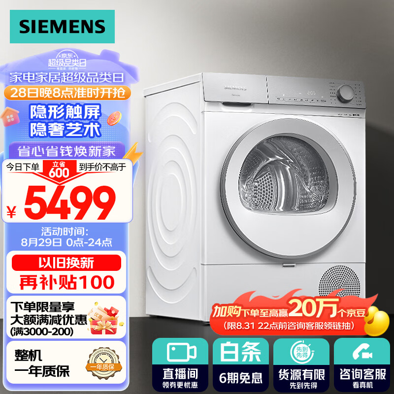 西门子(SIEMENS)小晶钻系列 烘干机家用 10公斤热泵干衣机 清新颜值 防缠绕舒展烘 除菌除螨 WQ53H2000W价格:5699.00元!