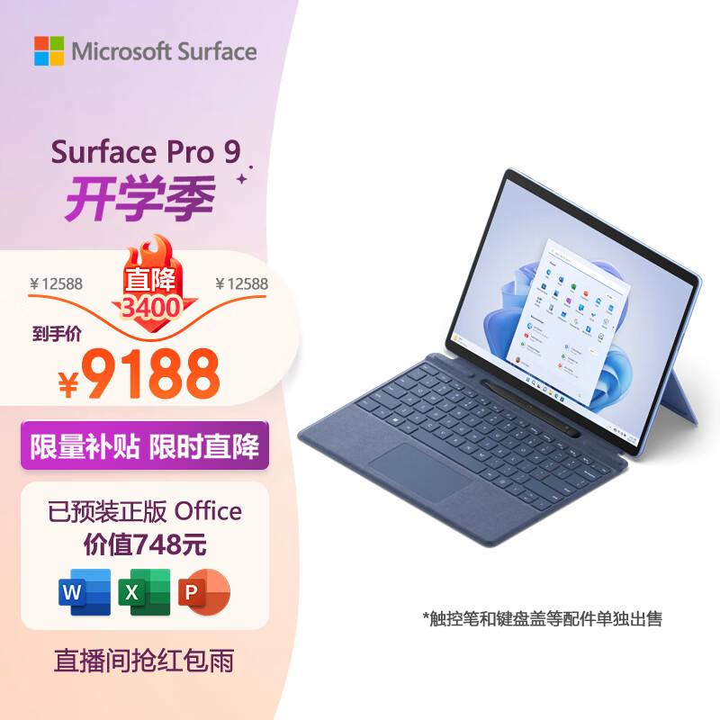 微软Surface Pro 9 二合一平板电脑 i7 16G+256G宝石蓝 13英寸120Hz触控屏 游戏平板 笔记本电脑价格:9188.00元!