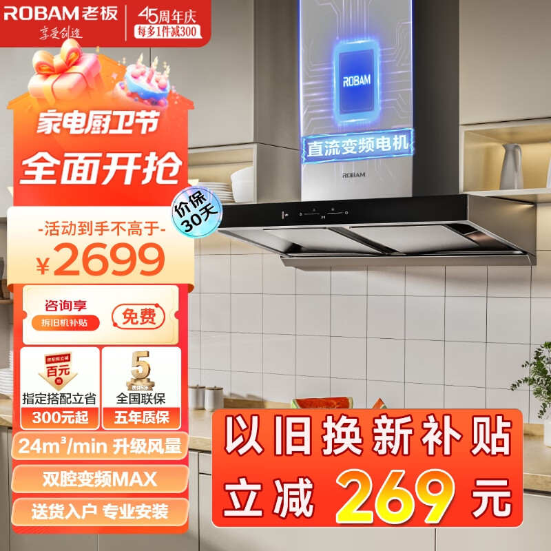 老板(Robam)抽油烟机欧式双腔变频油烟机家用大吸力 24m3/min超大吸力 直流变频 顶吸以旧换新吸油烟机60D3S价格:2699.00元!