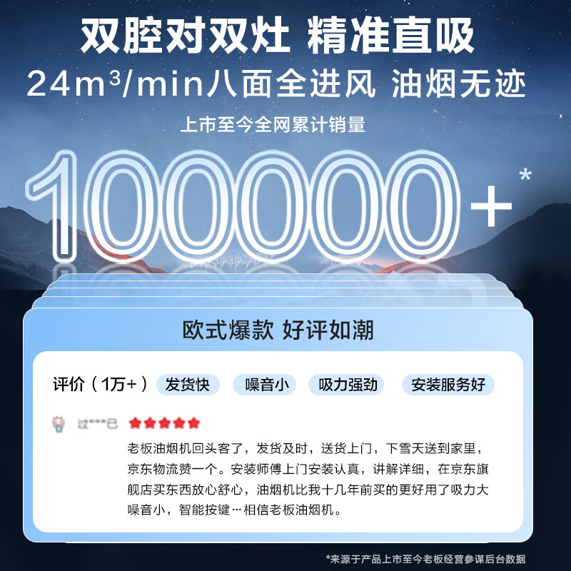 2、老板油烟机回头客了,发货及时,送货上门,下雪天送到家里,京东物流赞一个。安装师傅上门安装认真,讲解详细,在京东旗舰店买东西放心舒心。油烟机比我十几年前买的更好用了吸力大,噪音小,智能按键...相信老板油烟机。