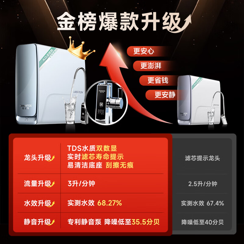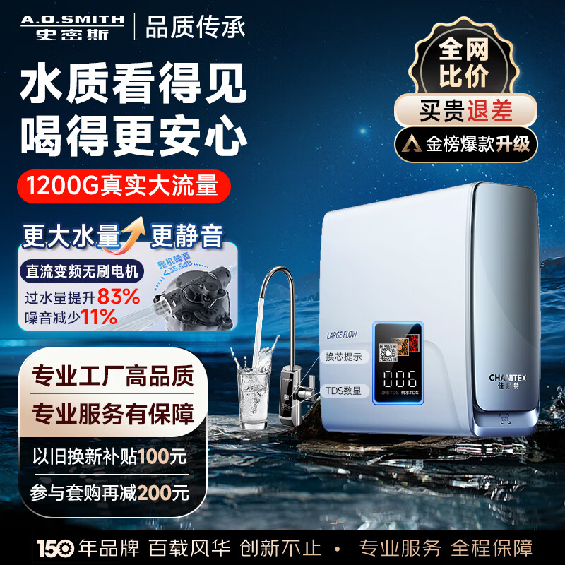 史密斯(A.O.SMITH)佳尼特净水器蓝鲸3000家用厨下式直饮净水机反渗透3升/分钟TDS双数显1200G CR3000AB1 以旧换新价格:4299.00元!