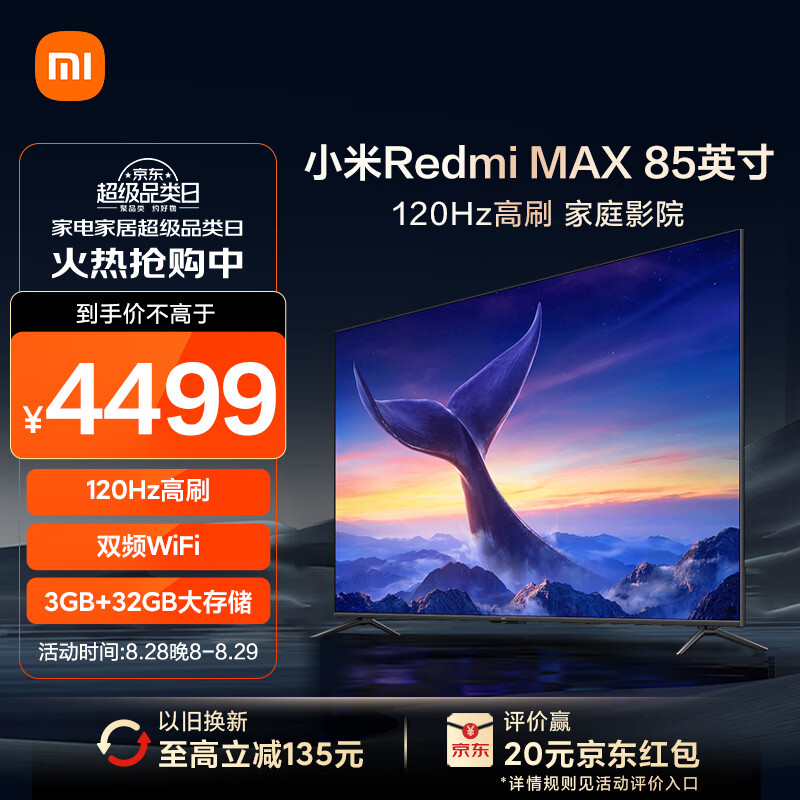 小米电视 85英寸 120Hz高刷 屏 智能平板75英寸+电视机 Redmi MAX85 L85RA-RX以旧换新价格:4499.00元!
