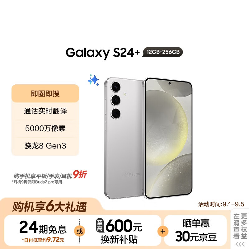 三星(SAMSUNG)Galaxy S24+ AI手机 智享生活办公 5000万像素 拍照手机 第三代骁龙8 游戏手机 12GB+256GB 雅岩灰价格:6999.00元!