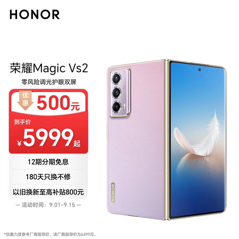 荣耀Magic Vs2 折叠屏 超轻薄设计 零风险调光护眼双屏 骁龙芯片 12+256 珊瑚紫 5G 长续航 AI智能手机价格:5999.00元!