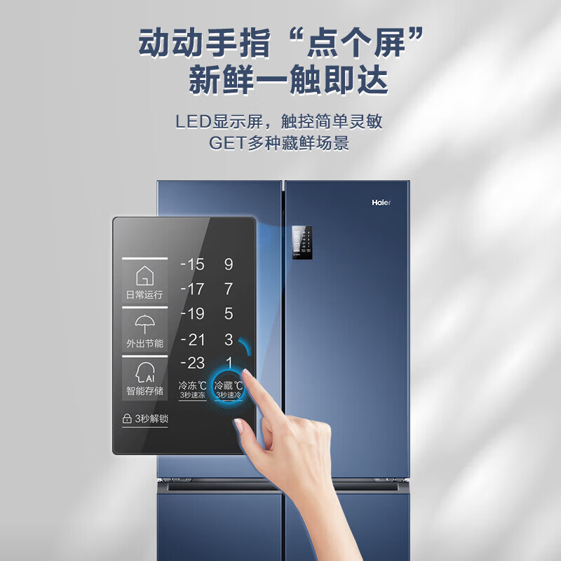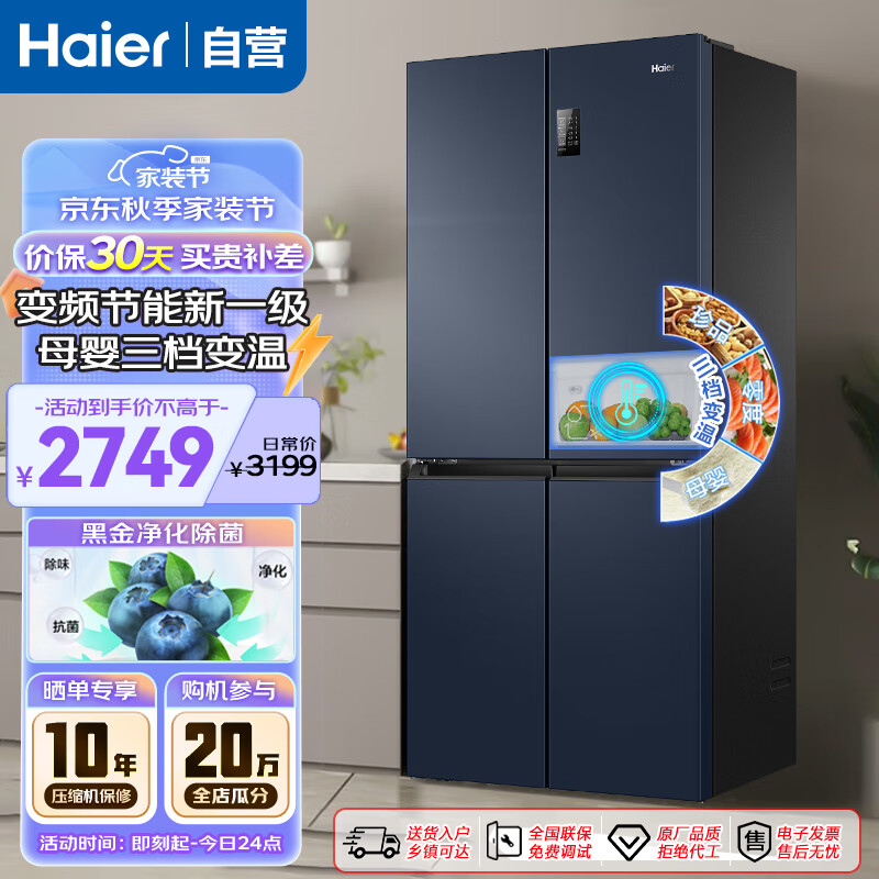 海尔(Haier)冰箱467升超薄节能一级能效双变频三档变温黑金净化十字对开门四开门多门冰箱家用大容量蓝色冰箱价格:3199.00元!