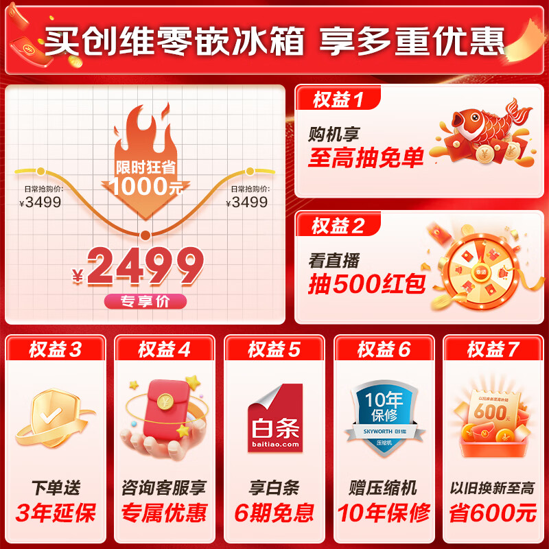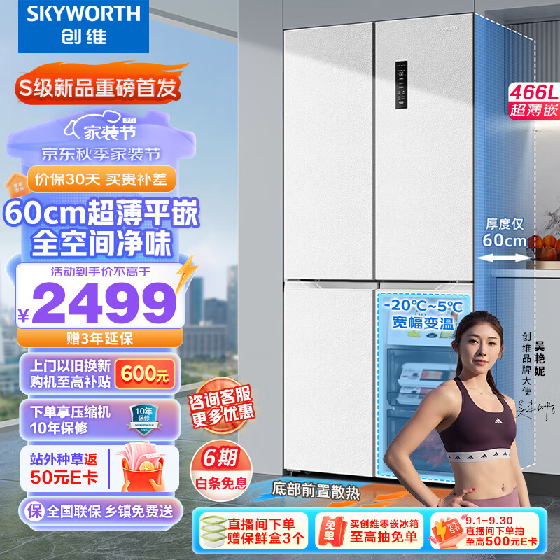 创维冰魔方 466升十字对开四开门60cm超薄平嵌入式家用冰箱白色大容量底部散热BCD-466W4QB1价格:2699.00元!
