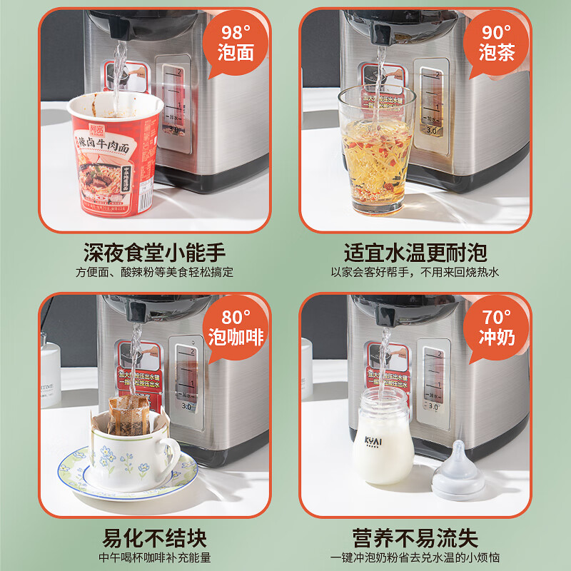 3、容量大小:5L大容量,一天两壶正好。烧水速度:烧水半个多小时,完全可以接受。保温预约:晚上睡前预约,第二天起来就有热水喝,这点非常方便。现在家里面用水量较大,比较了一下还是买了五升的,做饭直接接水,再也不用一壶一壶烧了。