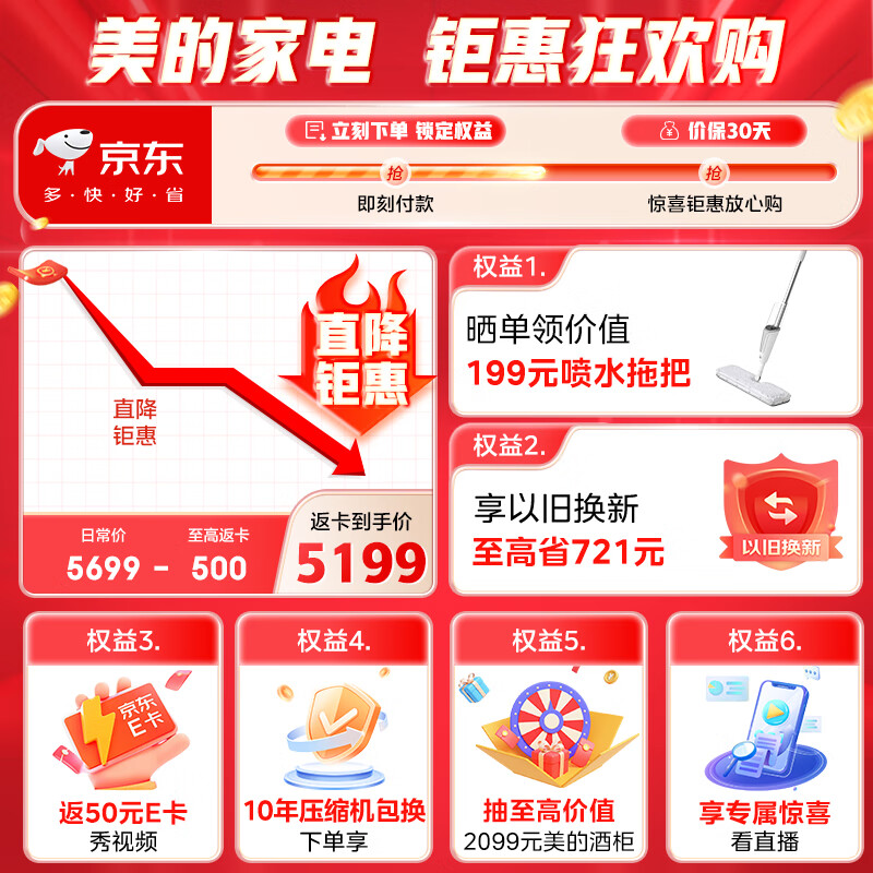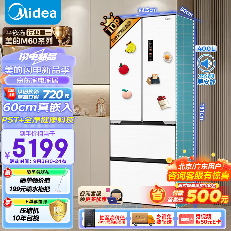 美的(Midea)M60大白豚421法式多门四开门超薄纯平全嵌无霜变频除菌净味大容量家用电冰箱MR-421WUFPZE底部散热价格:5999.00元!