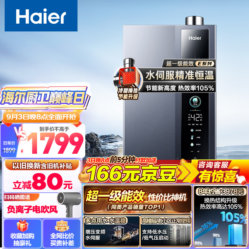 海尔16升燃气热水器天然气[【E5】超一级能效节能 增压变频水伺服恒温 JSLQ27-16E5DLPCU1【以旧换新】价格:1899.00元!